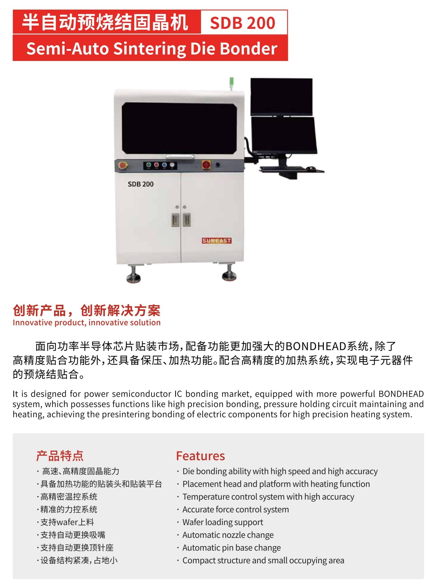 預(yù)燒結(jié)貼合機(jī)面向功率半導(dǎo)體芯片貼裝市場,配備功能更加強(qiáng)大的BONDHEAD系統(tǒng),除了高精度貼合功能外,還具備保壓、加熱功能。配合高精度的加熱系統(tǒng),實(shí)現(xiàn)電子元器件的預(yù)燒結(jié)貼合。